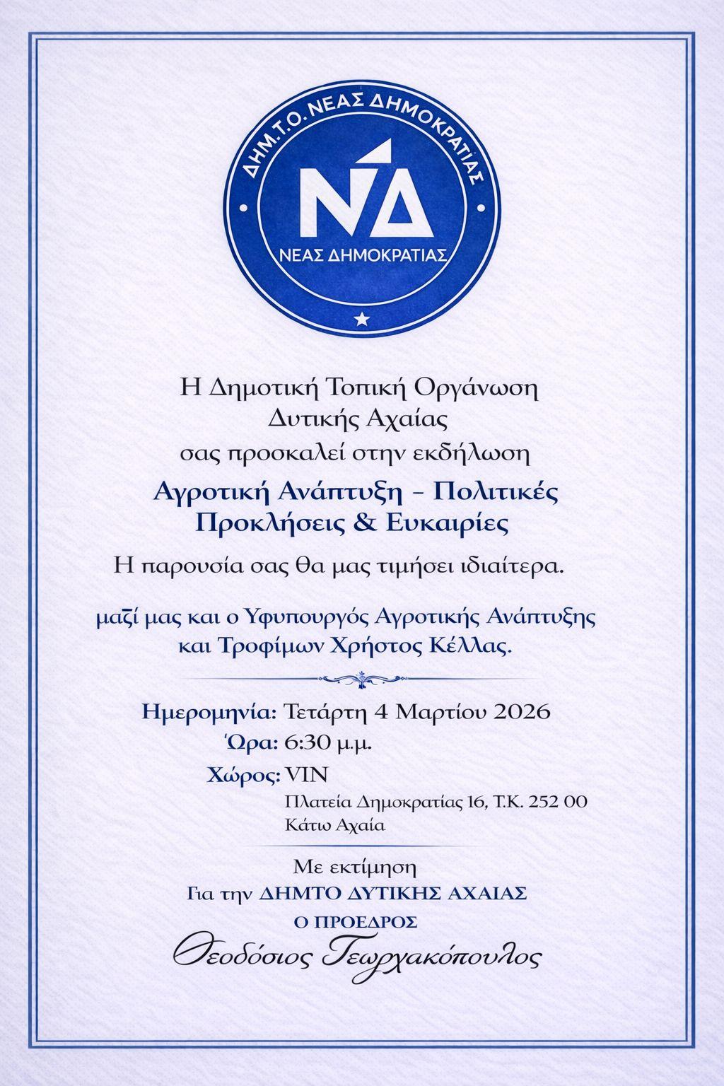 Η Διοικούσα Επιτροπή Εκλογικής Περιφέρειας (Δ.Ε.Ε.Π.) Αχαΐας της Νέας Δημοκρατίας προτρέπει τα μέλη και τους φίλους της παράταξης να παραστούν στην εκδήλωση που διοργανώνει η Δημοτική Τοπική Οργάνωση (ΔΗΜ.Τ.Ο.) Δυτικής Αχαΐας, συμμετέχοντας ενεργά σε μια συζήτηση που αφορά τον “πνεύμονα” της τοπικής μας οικονομίας.